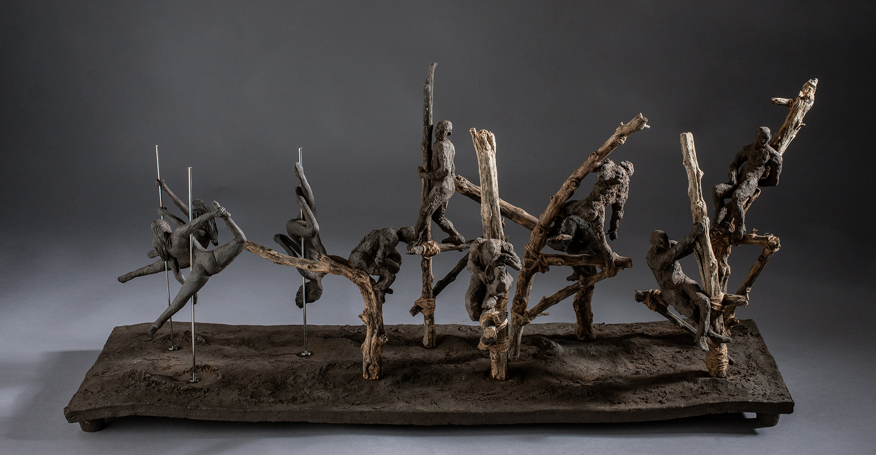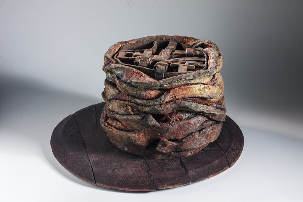 Materiales: cerámica técnica raku, hierro, madera y motivos vegetales.
