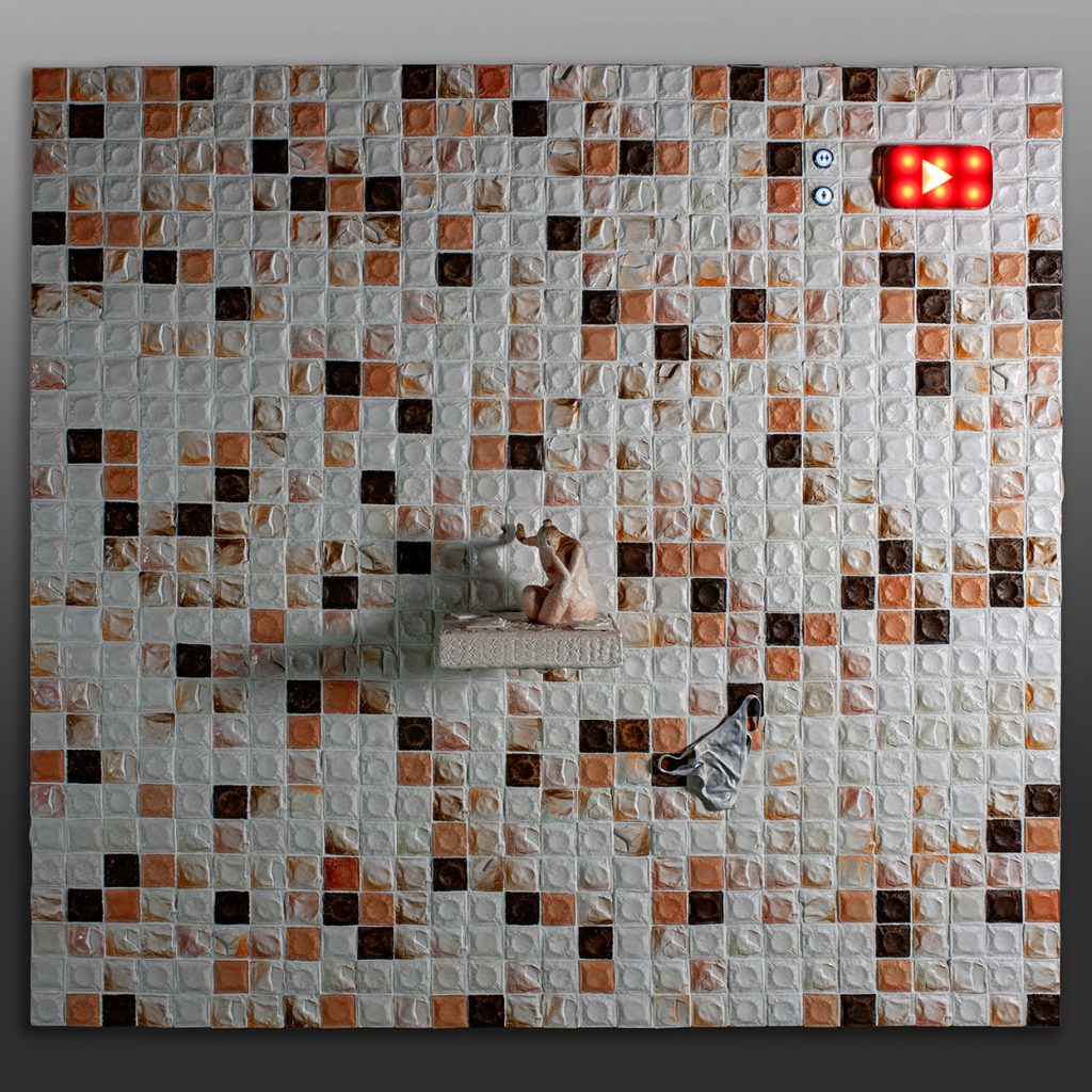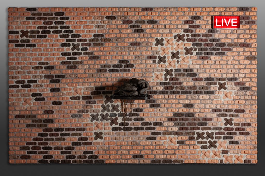 Esta obra intenta meterse en las entrañas del sufrimiento humano, en la angustia y la soledad del ser enfrentado así mismo, del ser desnudo absolutamente al descubierto; habla de la vulnerabilidad, de verse sobrepasado y lo hace mediante la tensión y la distorsión de la figura humana situada en el centro de la obra, resguardada en posición fetal de autoprotección sobre un jergón precario, en un entorno en forma de muro de tiritas sanitarias que simbolizan el parcheamiento y la provisionalidad prolongada en el tiempo. La palabra LIVE iluminada en un lateral indica la presencialidad del momento.