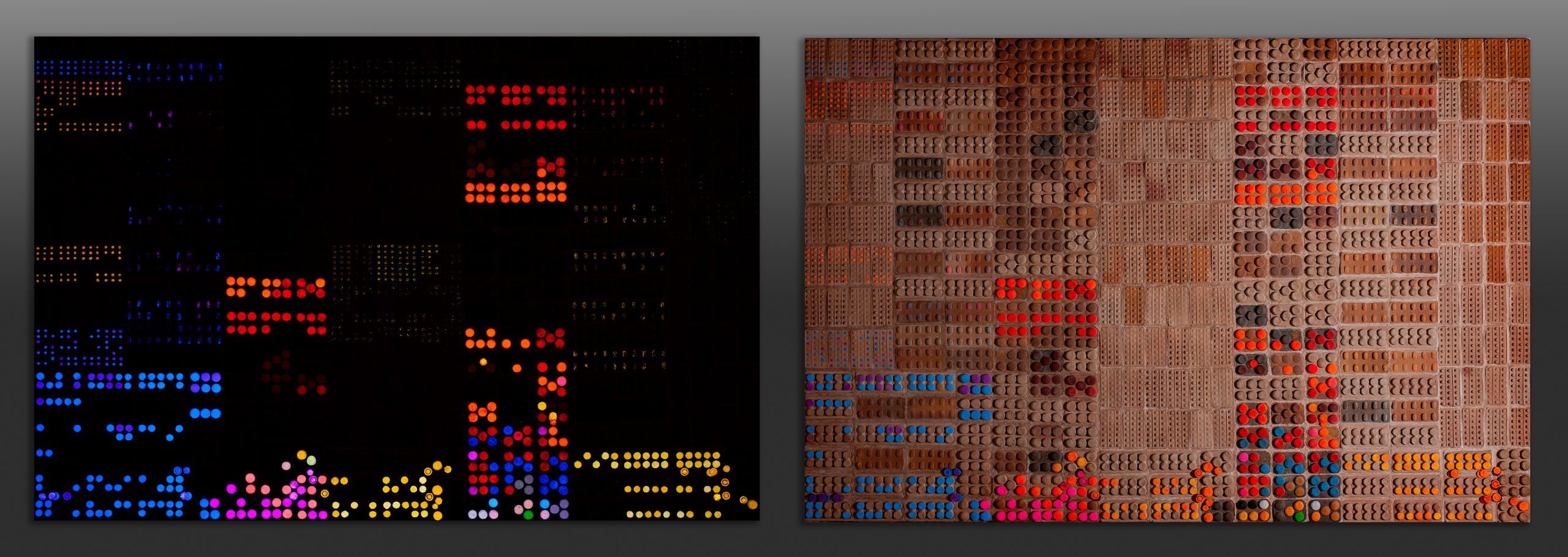 Materiales: cerámica con la técnica de decoración sigilata, acero inoxidable y vinilo retroiluminado por leds.